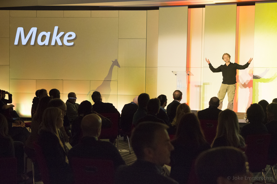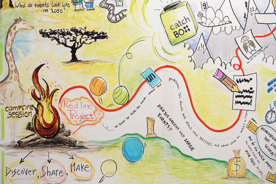 We designed a “Storytelling around the campfire” session. Transforming the plenary room into with a gigantic backwall video of the african sunset, small groups seated on soft seats around a ‘imaginable fire’ made you instantly forget the freezing cold outside. In a moment of magical silence and darkness we asked the delegates to write down their best ever event experience and share it. Resulting in hundreds of inspiring stories hanging on the Red Line Gallery. On top of that we wrapped up Fresh with poem introducing the upcoming theme of 2015 ‘Arts’.
