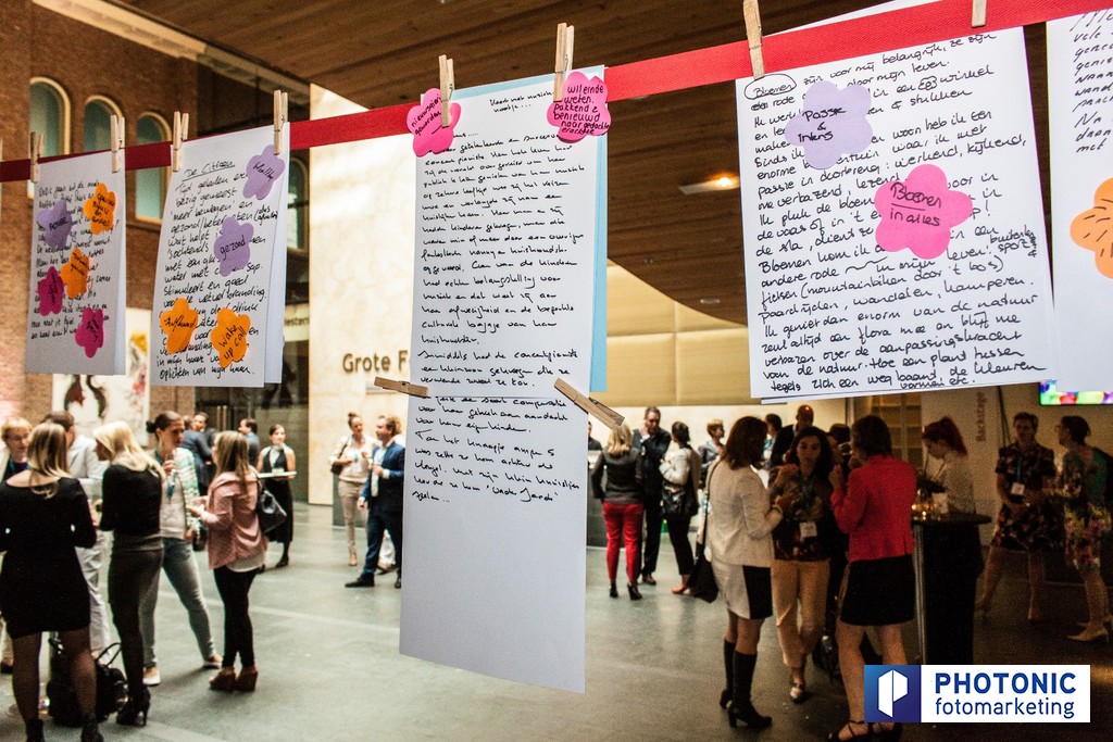 The result:The visitors were asked to bring a small personal item (with a story) to the conference. A Red Line full of inspirational items decorated the venue. At the Storytelling workshops we asked the participants to grab an item of the Red Line that inspired them, write a story, share it and provide each other feedback on flowery post-it notes. The result was a long The Red Line with colourfull and inspiring stories creating a lot of attention and curiousity from the visitors looking for stories about their personal item. Finally we summarized the conference with 2 poets tickling many more senses before going home.